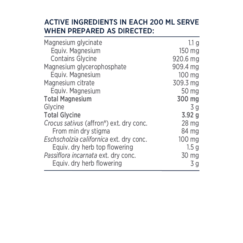 This high-dose, bioavailable night-time magnesium blend combines nutrients and calming botanicals to promote deep, restorative sleep. Each serving provides 300 mg of magnesium from a unique blend of three highly absorbable salts, along with 3.9 g of glycine to support relaxation. Featuring Affron™ — a clinically studied saffron extract shown to improve sleep quality — plus passionflower and California poppy, this formula helps balance mood and ease the mind. With a refreshing natural lemon lemonade flavour, it’s a delicious way to support healthy sleep and wake up feeling restored.